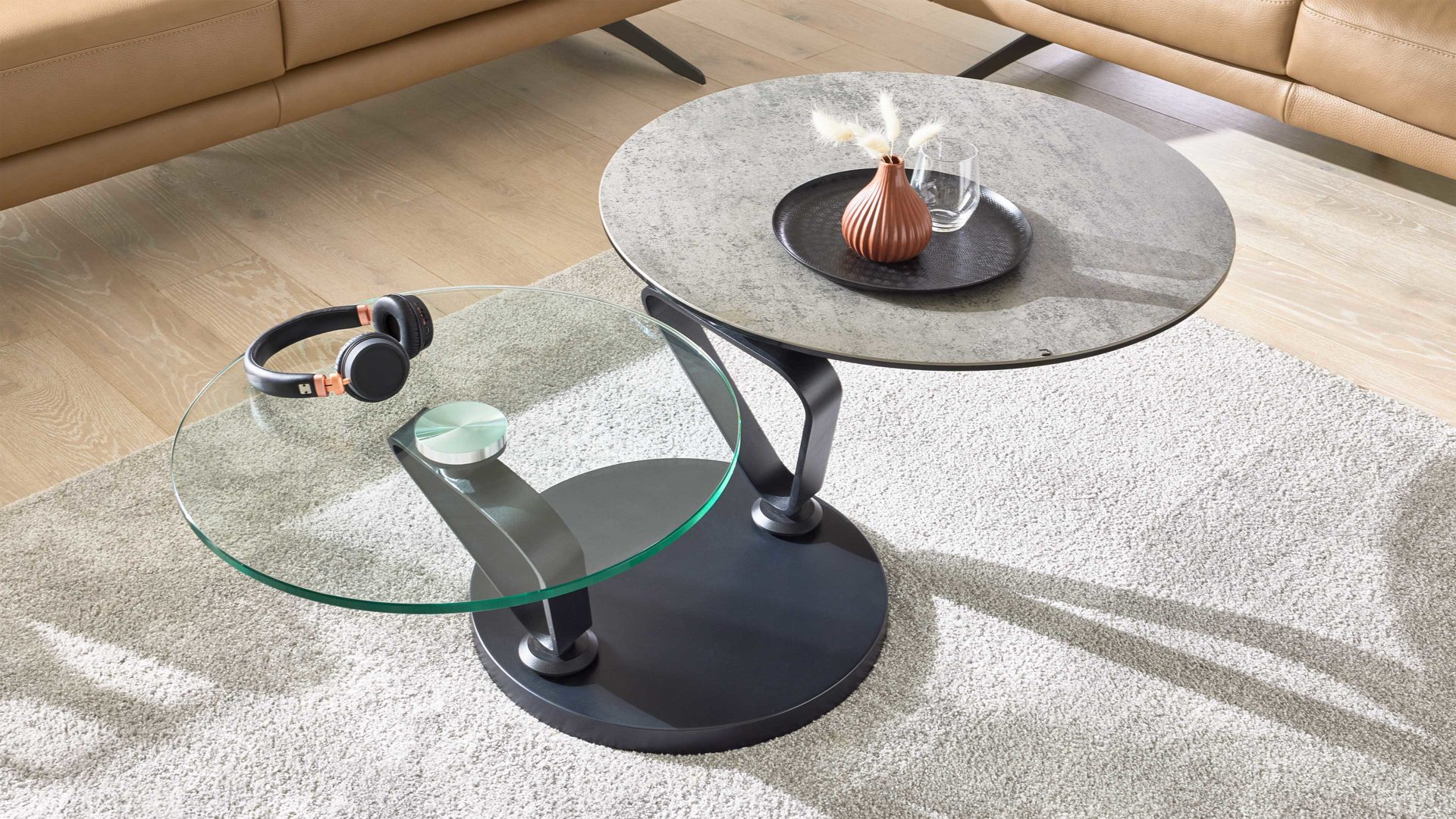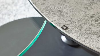 Neben seiner edlen Optik begeistert der Tisch durch seine durchdachte Mechanik. Die 3 mm starke Keramikplatte ist robust, pflegeleicht und äußerst langlebig. Sowohl Keramik- als auch Glasplatte sind schwenkbar, sodass du die Tischfläche flexibel anpassen kannst – perfekt, um sie an unterschiedliche Sitzpositionen oder Nutzungssituationen anzupassen. Je nach Ausrichtung variiert der Durchmesser von ca. 75 cm bis 130 cm, bei einer Höhe von ca. 42 cm. So wird der Tisch zum funktionalen Drehpunkt deines Wohnbereichs und passt sich jeder Raumsituation mühelos an.