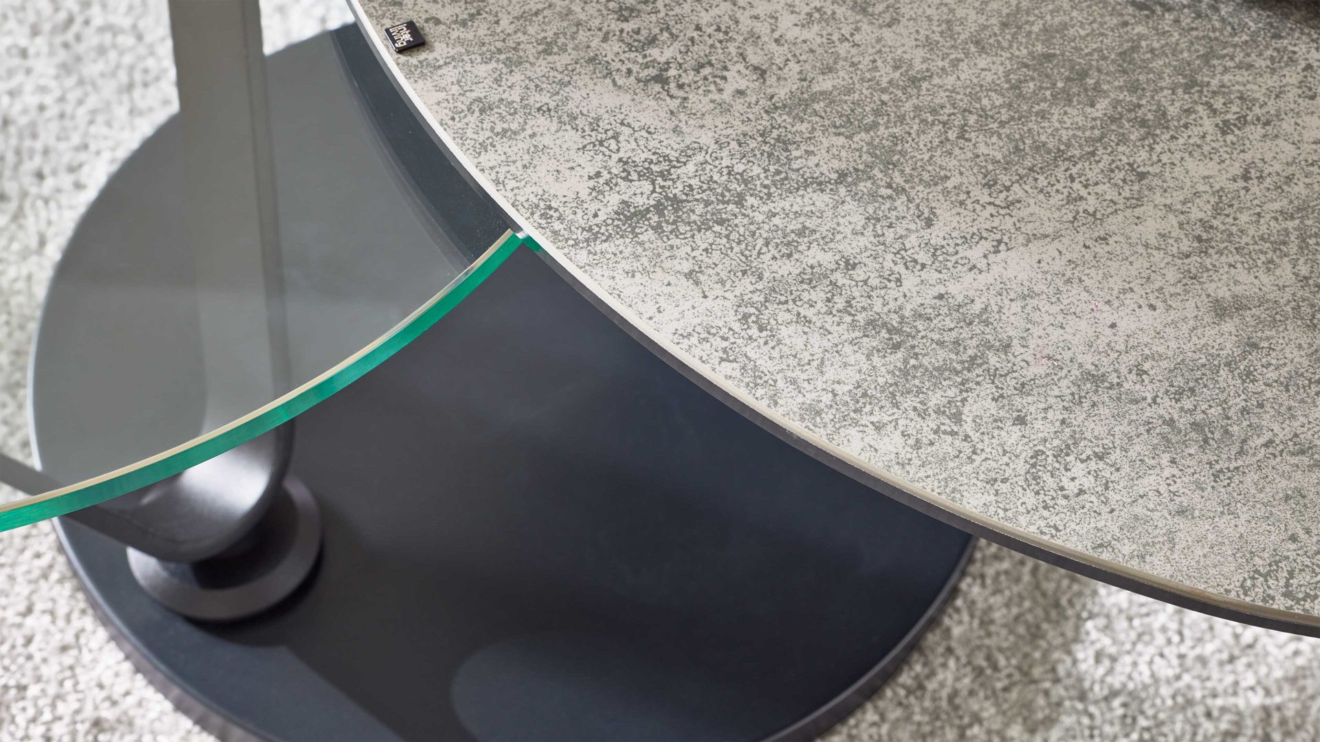 Dieser Funktionscouchtisch überzeugt durch seine silberfarbene Keramik-Tischplatte, die fest auf einer klaren Glasplatte verklebt ist. Die Kombination wirkt optisch leicht, bietet zugleich jedoch hohe Stabilität und Widerstandsfähigkeit. Ergänzt wird das elegante Design durch eine mattschwarz lackierte Stahlplatte, die dem Tisch Tiefe und Charakter verleiht. Die Verbindung dieser drei Materialien – Keramik, Glas und Stahl – schafft eine harmonische Balance aus Eleganz, Moderne und industrieller Klarheit.