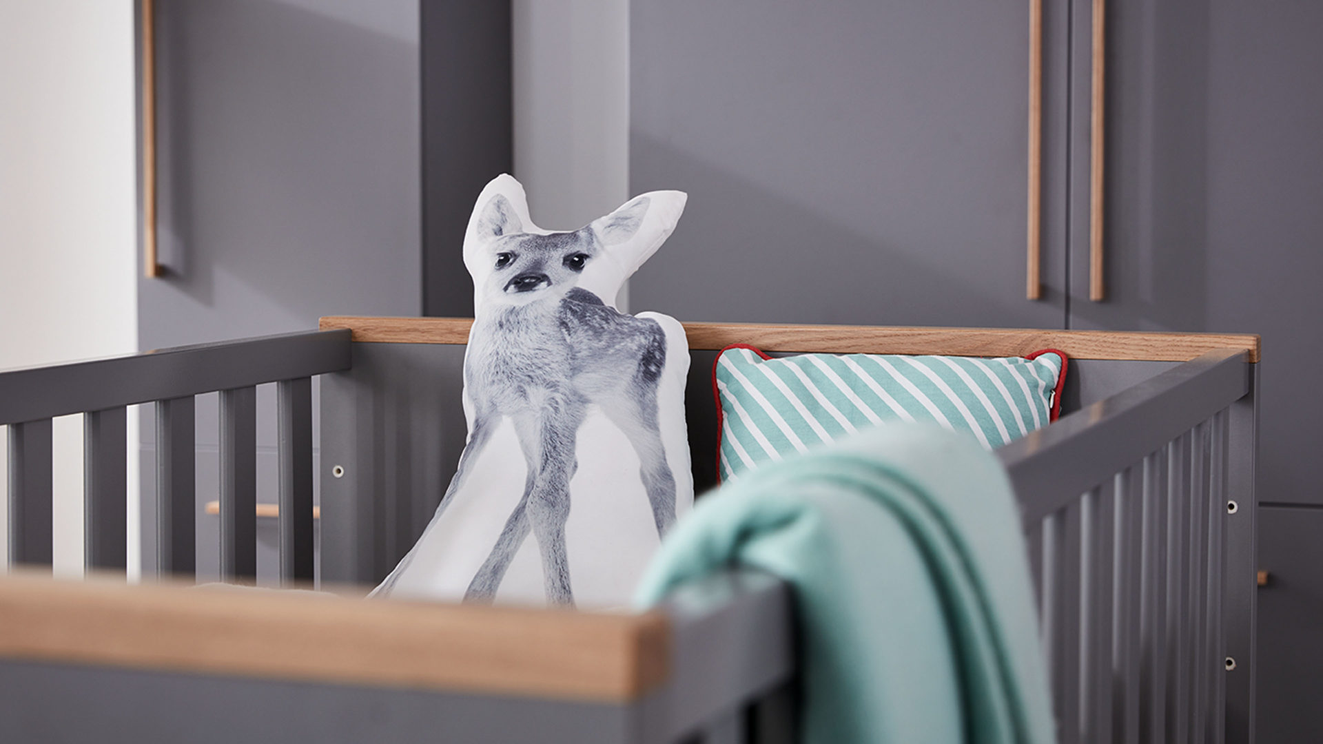 Das hochwertige Bettgestell des PAIDI Babyzimmers Sten kombiniert massive Eiche mit schiefergrauen Melaminoberflächen. Letztere zeichnen sich durch ihre Lichtechtheit sowie die besonders ausgeprägte Kratz- und Stoßfestigkeit aus. Überdies sind sie sehr pflegeleicht. Die massive Eiche begeistert mit ihrer extremen Robustheit und Stabilität. Zudem strahlt sie warme Natürlichkeit aus. Der Holzton harmoniert wunderbar mit dem Schiefergrau. Zusammen sorgen die Nuancen für eine moderne und elegante Optik.