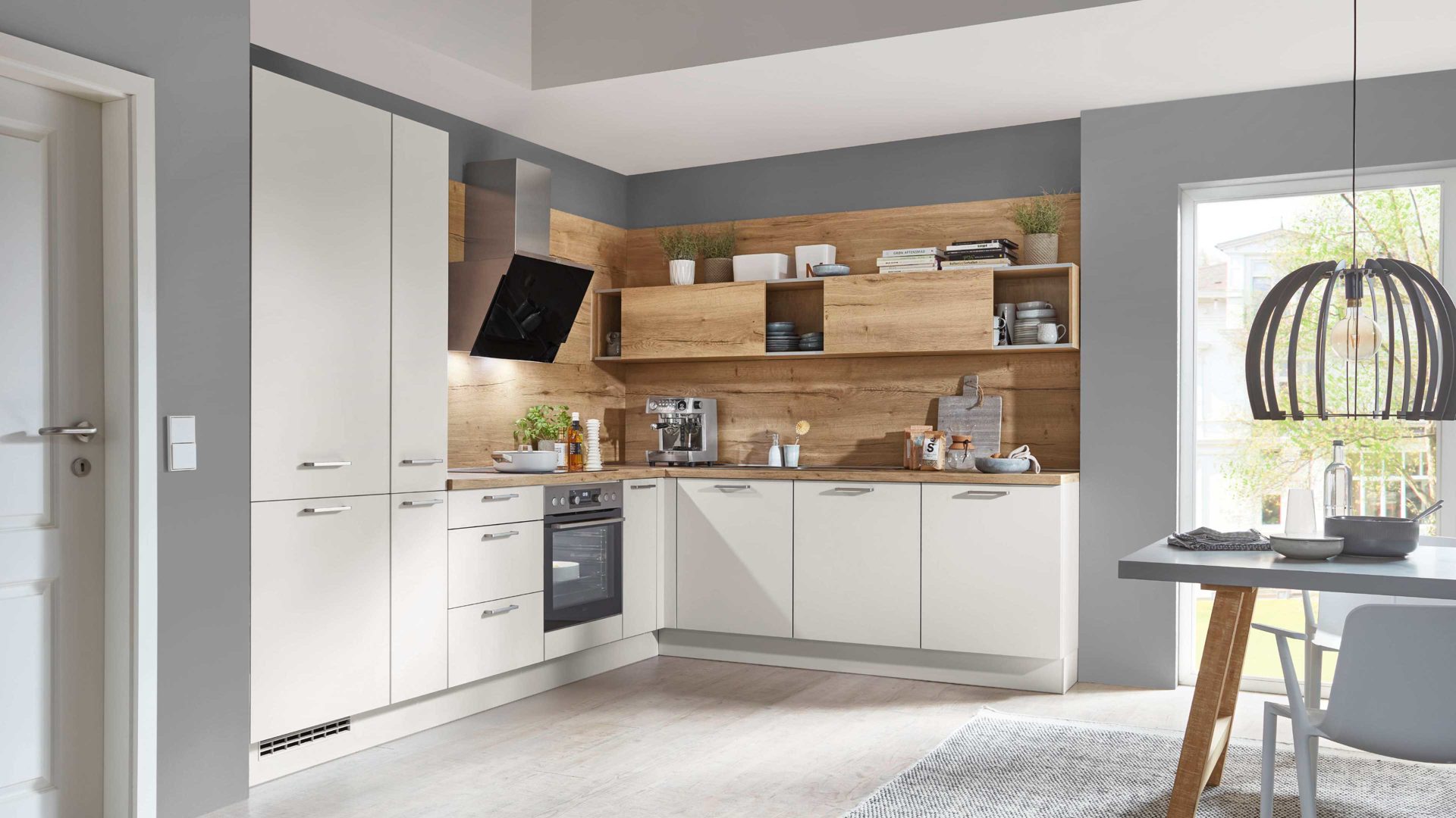 Seidengrau, kombiniert mit Eiche Sierra-Nachbildung und edelstahlfarbenen Metallgriffen