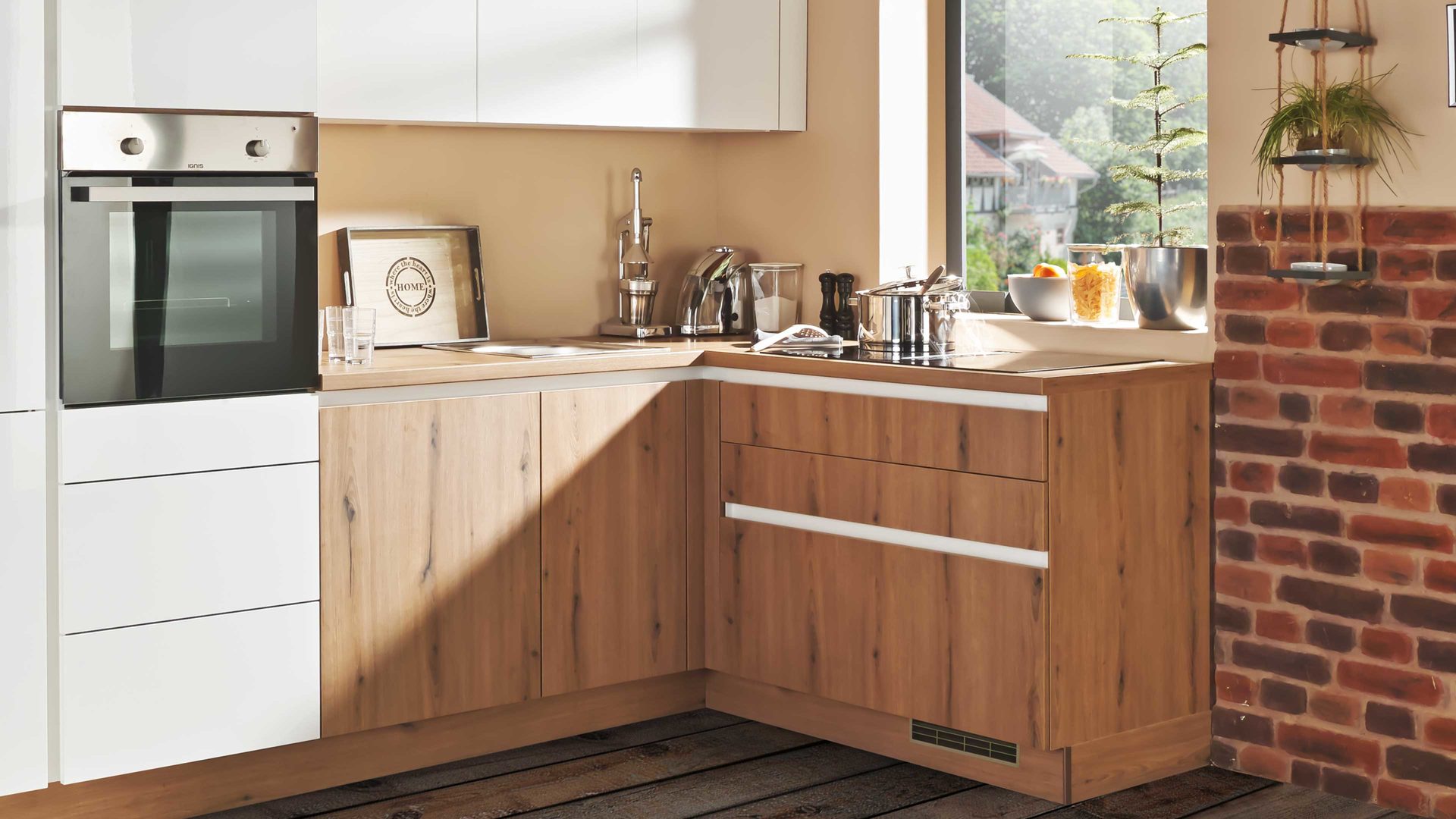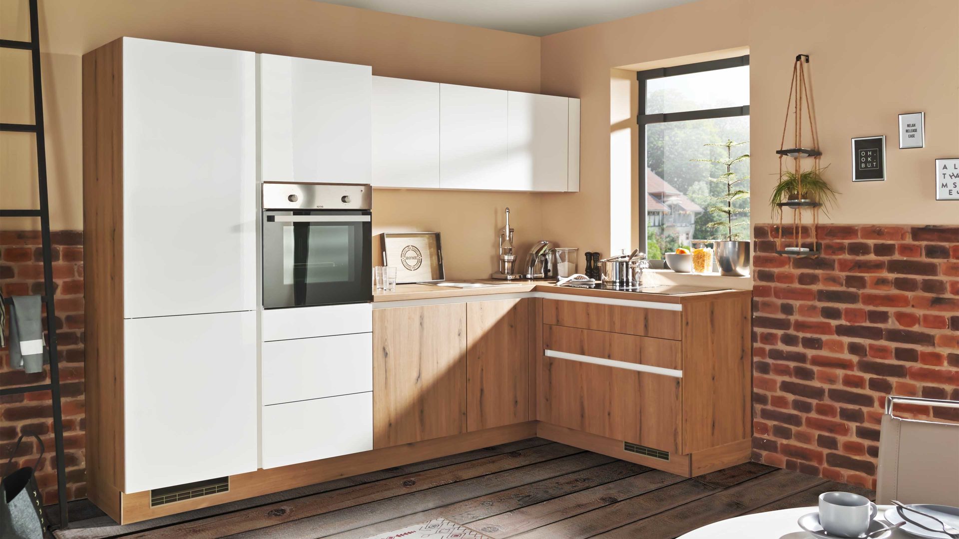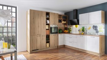 weiße Lacklaminat-Hochglanzfronten, kombiniert mit astiger Eiche-Nachbildung