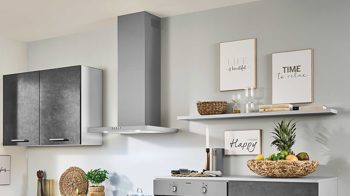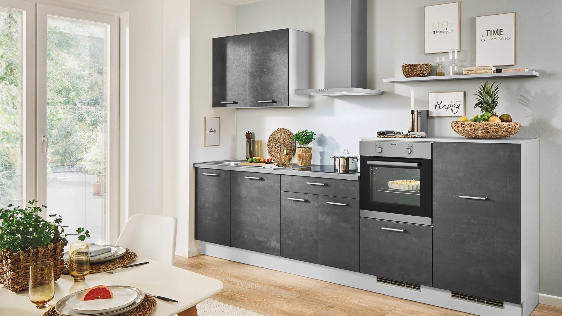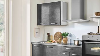 Diese pino Einbauküche kombiniert Fronten in graphitgrauer Beton-Nachbildung mit Korpusseiten, Sockelblenden und einem Regalboden in Lichtgrau. Einen stilvollen Akzent setzt die Arbeitsplatte in perlgrauer Beton-Nachbildung. Edelstahlfarbene Bügelgriffe runden die modern-elegante Optik perfekt ab.