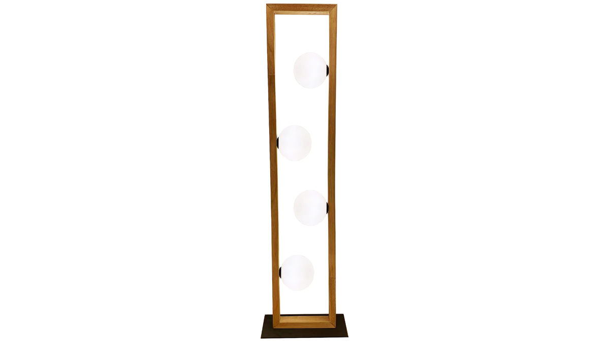 naturfarbenes Holz, matt opalweißes Glas und mattschwarzes Metall