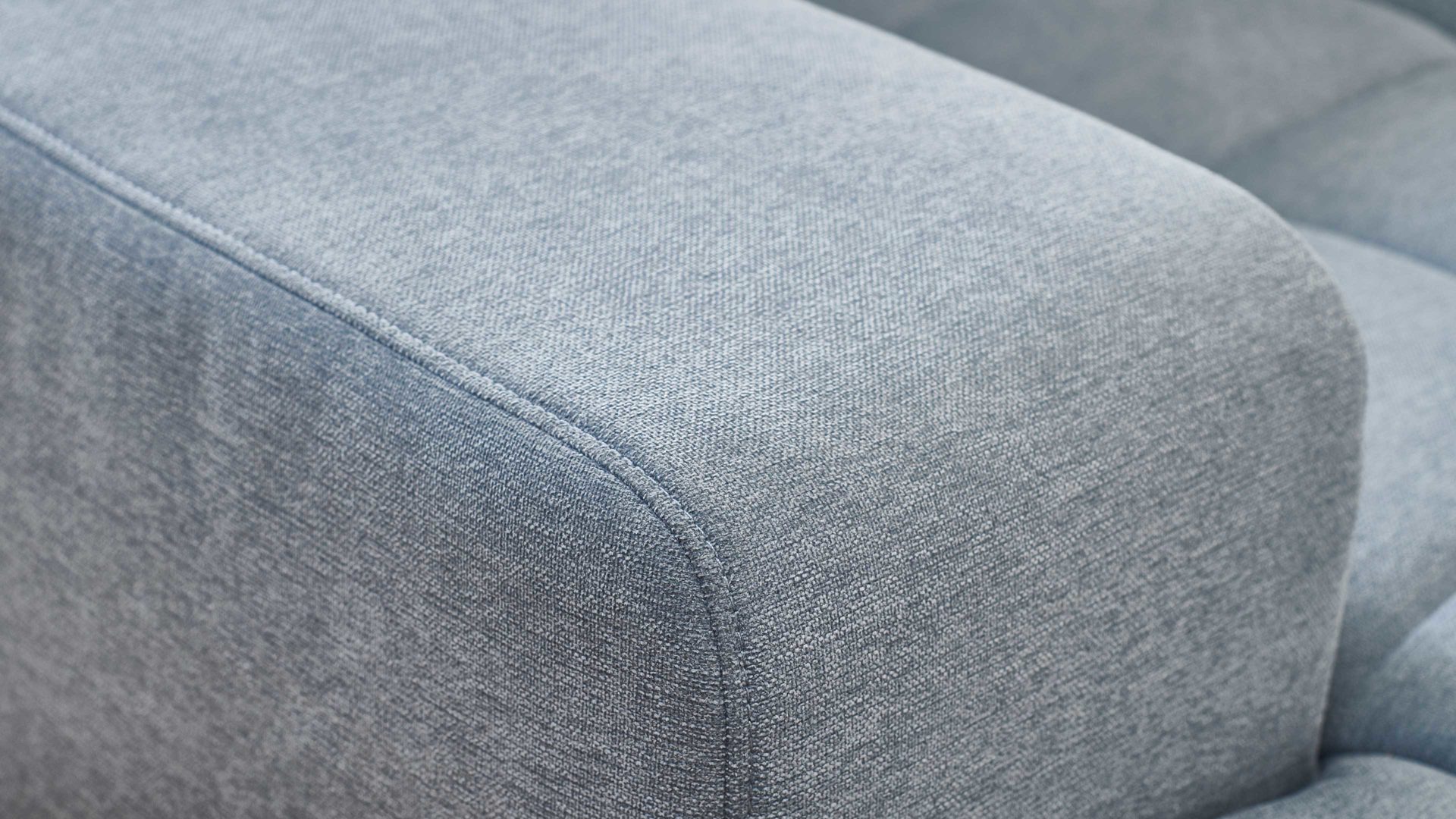 Zu den Highlights der Couchlandschaft gehören die mittels Rasterbeschlag mehrfach verstellbaren Kopfpolster an allen Elementen. Des Weiteren gewährleisten die hohen Füße, die preisgleich auch verchromt erhältlich sind, eine beachtliche Bodenfreiheit. Letztere ist perfekt für den Einsatz eines Staubsaugerroboters.