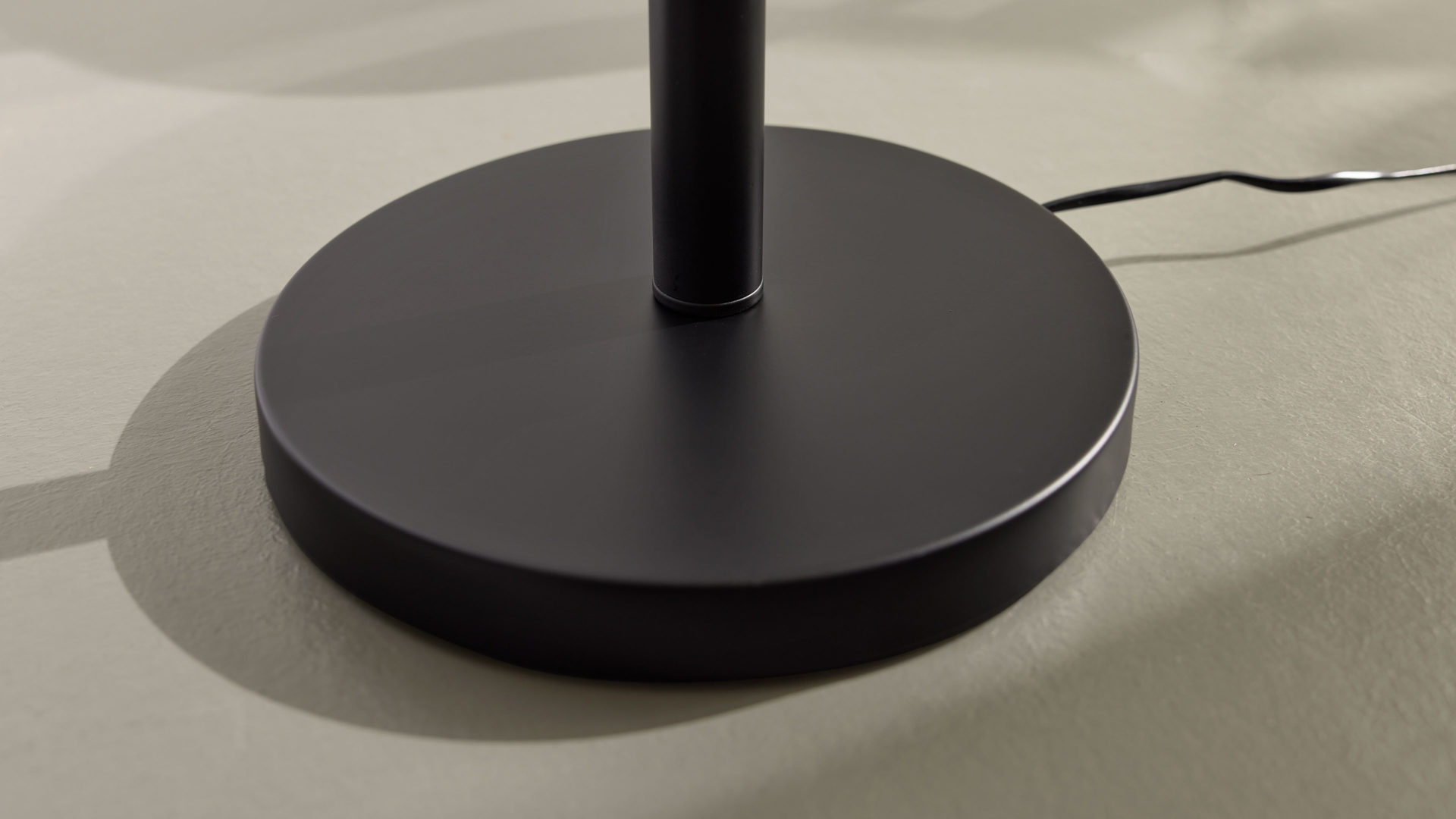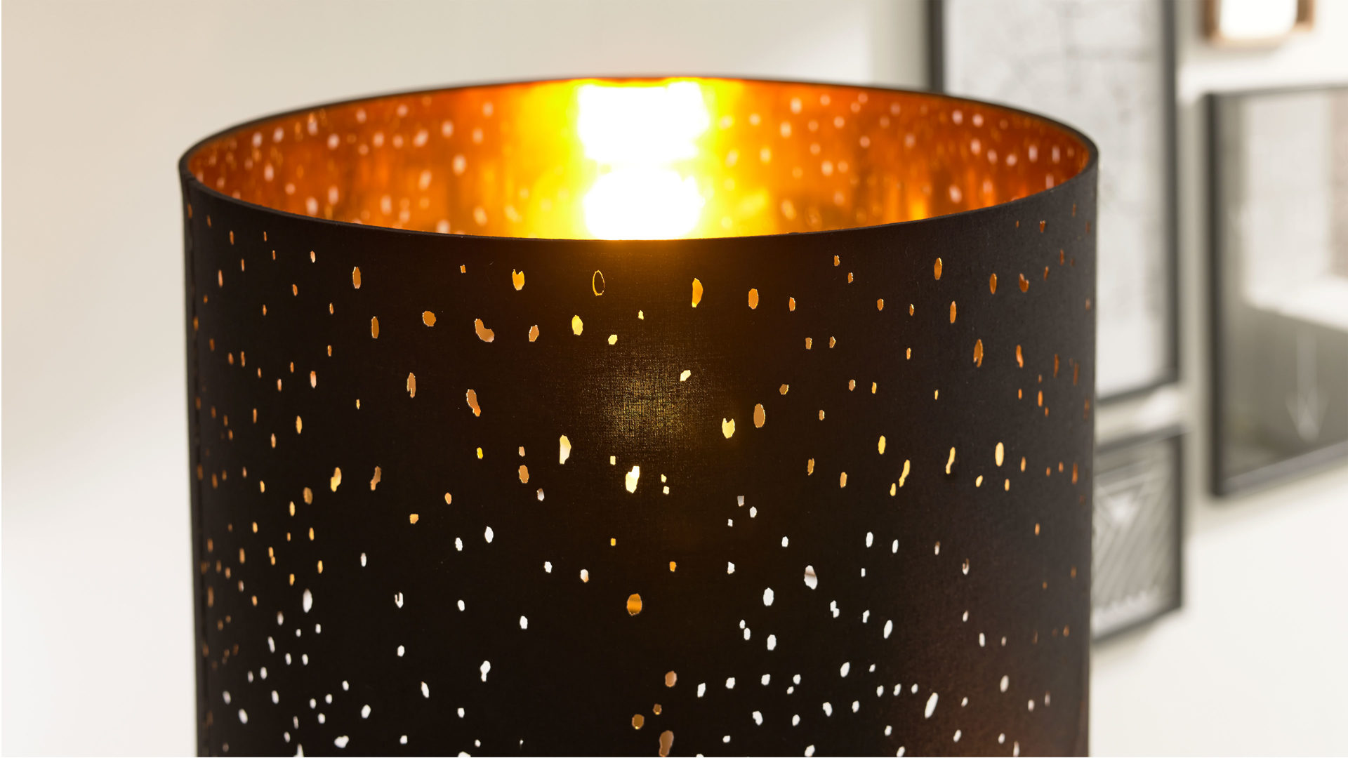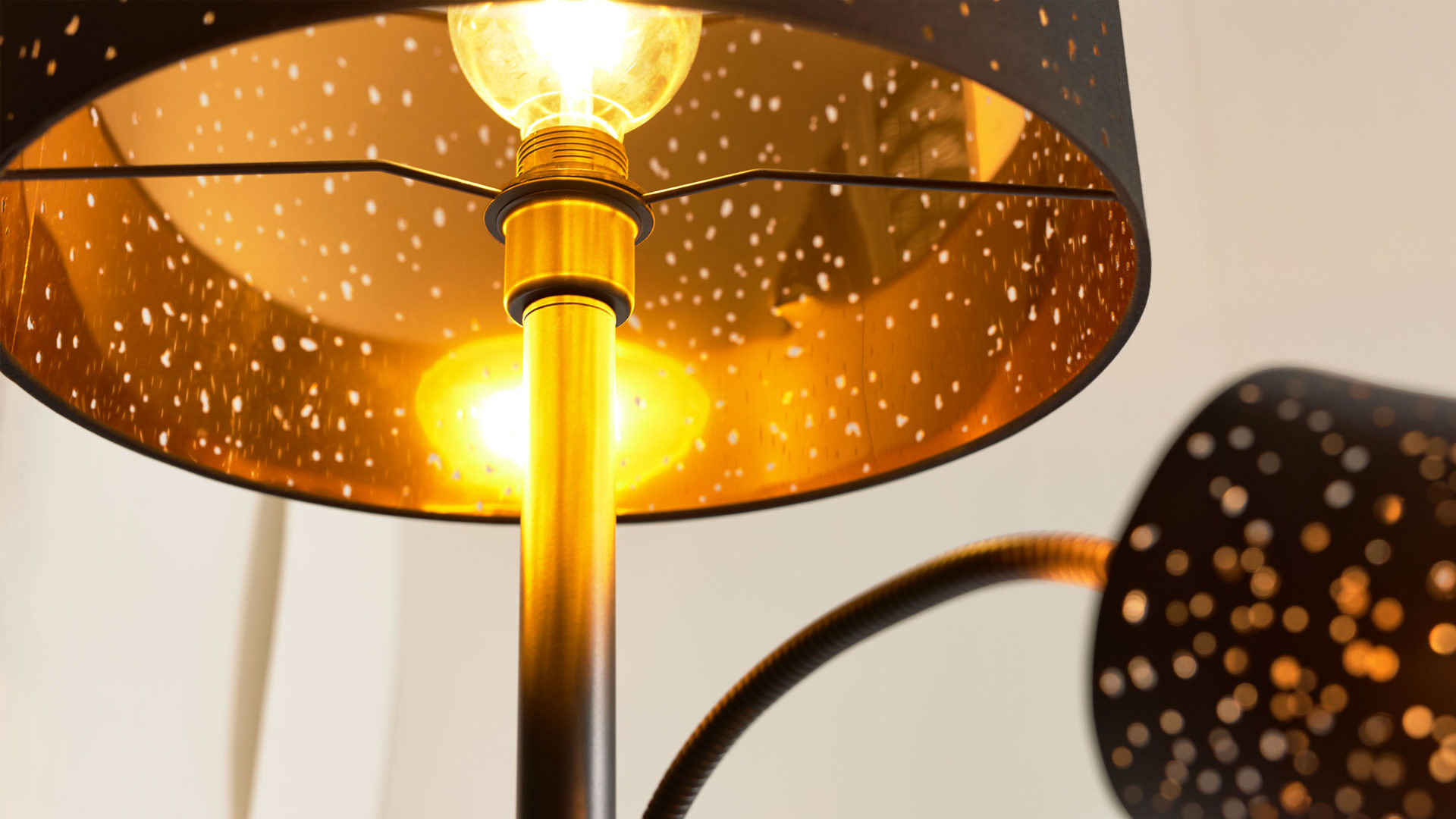 Innen sind beide Lampenschirme goldfarben kunststoffbeschichtet. Dieses Merkmal unterstreicht die elegante Optik der Standlampe, die ein mattschwarzer Metallfuß stilsicher abrundet.