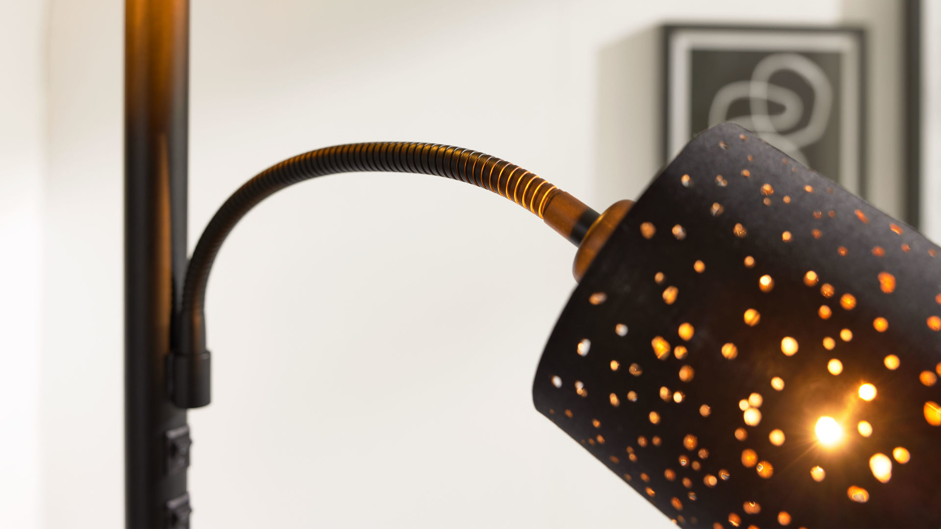 Die moderne Stehleuchte aus der Interliving Leuchten Serie 9343 umfasst einen großen und einen kleinen schwarzen Textillampenschirm mit Dekorstanzung für einen romantischen Sterneneffekt.