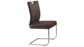 Der Schwingstuhl präsentiert sich modern und edel. Mit dem genarbten Webstoffbezug in tiefem Dunkelbraun strahlt er Wärme und Eleganz aus - Eigenschaften, die jeden Raum und Stil aufwerten. Das Edelstahlgestell sorgt durch die klassische Farbgebung für eine harmonische Abrundung und gewährleistet dank des robusten Materials die beim Sitzen und lockeren Schwingen erforderliche Stabilität.