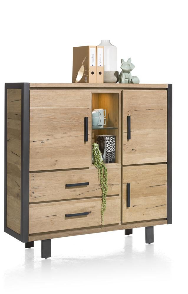 Das Highboard Brooklyn 37135RWB aus dem Hause Habufa kombiniert eine moderne, handwerkliche Optik mit praktischen Stauraum. Bei der Herstellung kommen Materialien wie massive Eiche (Korpus), Eichen MDF 3D Furnier (Fronten) und Metall (Applikationen) zur Verwendung. Das Highboard ist auf Füßen gelagert, welche dem Möbelstück eine moderne Optik verleihen. Die Oberfläche ist bewusst natürlich belassen, das Holz weißt Astlöcher, Unebenheiten und Wachstumsrisse auf, die der Charakterbildung dienen und jedes Highboard Brooklyn einzigartig machen. Manche Astlöcher sind mit schwarzem Spachtel gefüllt, der optimal mit den Metallapplikationen harmoniert. Die mit LED beleuchtete Nische lädt zum Dekorieren ein, hier kommen Ihre besten Stücke perfekt zur Geltung. Die beiden Schubkästen und die drei Nischen hinter den Drehtühren bieten viel Platz zum Verstauen von Utensilien aller Art. Das Highboard wird montiert geliefert, bitte beachten Sie aufgrund der Sperrigkeit, dass es an den Verwendungsort getragen werden kann, eine Rücknahme aufgrund von Platzmangel ist leider nicht möglich.