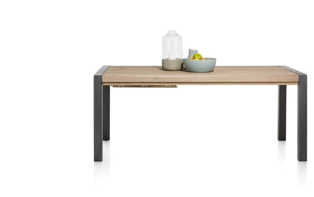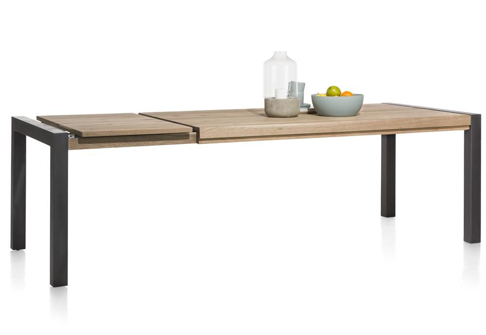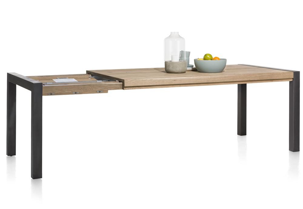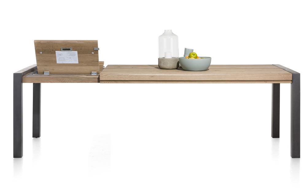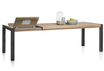 Der Tisch Brooklyn 37155RWB von Habufa können Sie bei Bedarf im Handumdrehen um ca. 60 cm erweitern. Dank seines Butterflyauszuges ist die Ansteckplatte im inneren des Tisches gelagert und benötigt keinen zusätzlichen Stauraum im Esszimmer. Die Tischplatte besteht aus massiven Eichenholz, welches weitgehend in seinem Urzustand belassen wurde. Astlöcher, Wachstumsrisse und Unebenheiten geben dem Tisch seinen unverwechselbaren Charakter und machen jedes Möbelstück der Habufa Brooklyn Reihe zu einem echten Unikat. Manche stellen sind mit einem schwarzem Spachtel versehen, der optimal mit dem Metallgestell harmoniert. Ausgezogen erhalten Sie eine Breite von ca. 250 cm, also genug Platz für einen schönen Abend mit Besuch.