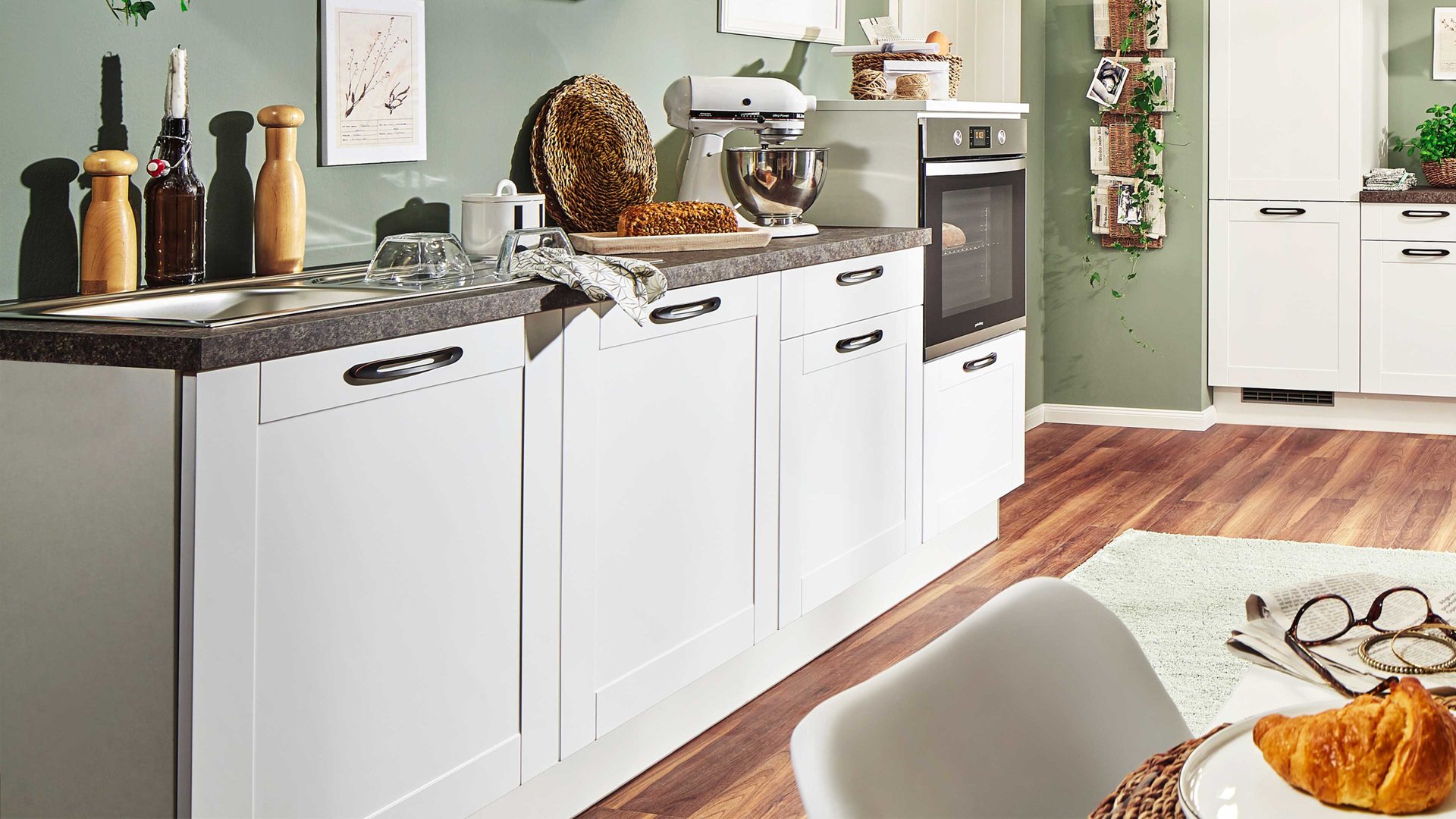 Diese pino Einbauküche kombiniert mattweiße Fronten mit weißen Korpussen und Sockelblenden. Einen stilvollen Akzent setzen die Arbeitsplatten in graubrauner Granit-Nachbildung. Edle Bügelgriffe runden die modern-elegante Optik perfekt ab.