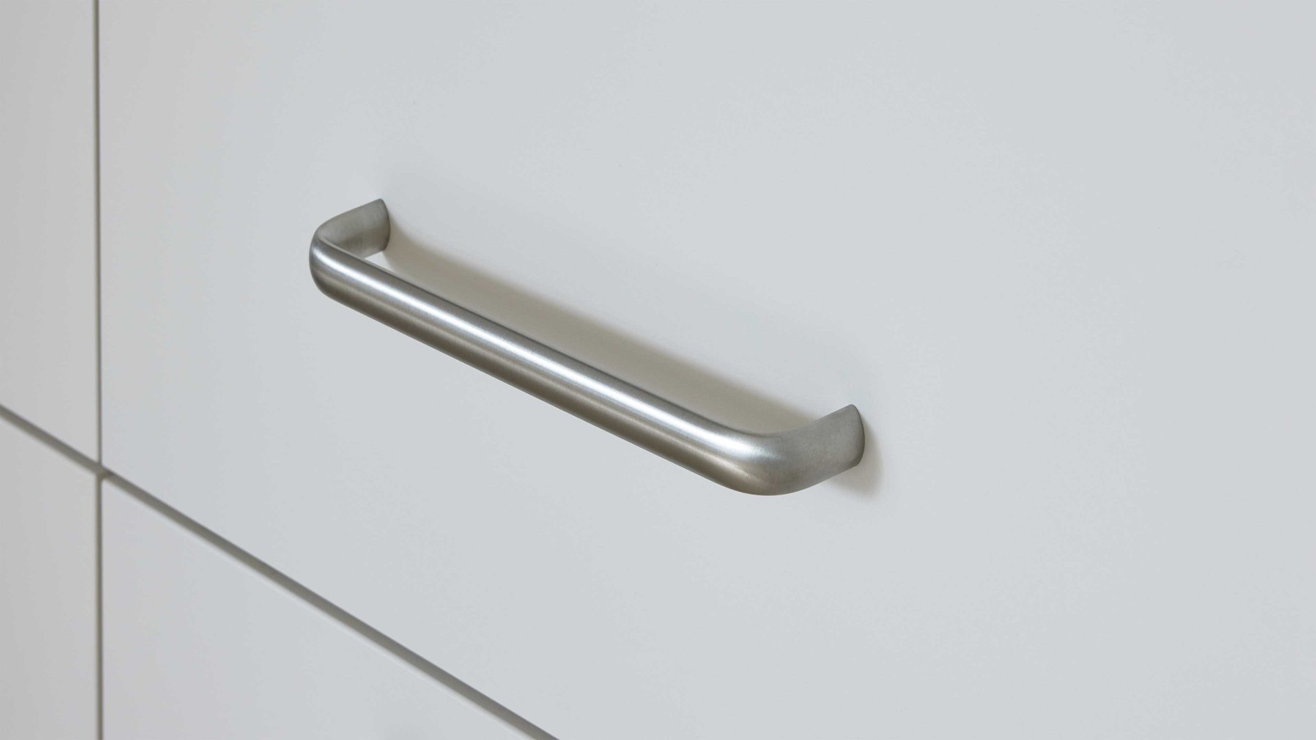 matte muschelweiße Fronten mit Edelstahl-Bügelgriffen und naturweiße Korpusse