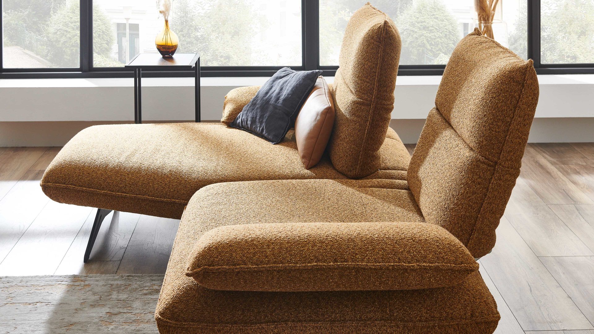 Das manuelle Kopfteilverstellungssystem ermöglicht verschiedene Positionen für optimalen Komfort. Gleiches gilt für die manuelle Armteilverstellung, bei der durch einfaches Ziehen über die höchste Position hinaus das Armteil wieder in die Grundposition zurückkehrt.