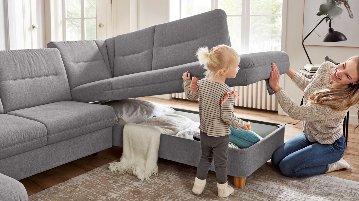 die Sitzfläche wird nach oben aufgeklappt, darunter befindet sich ein geräumiger Stauraum