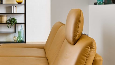 die Kopfstütze wird in die Kopfstützvorrichtung an der Rückenlehne des Sofas eingesteckt und lässt sich dann in der Höhe und in der Neigung manuell verstellen