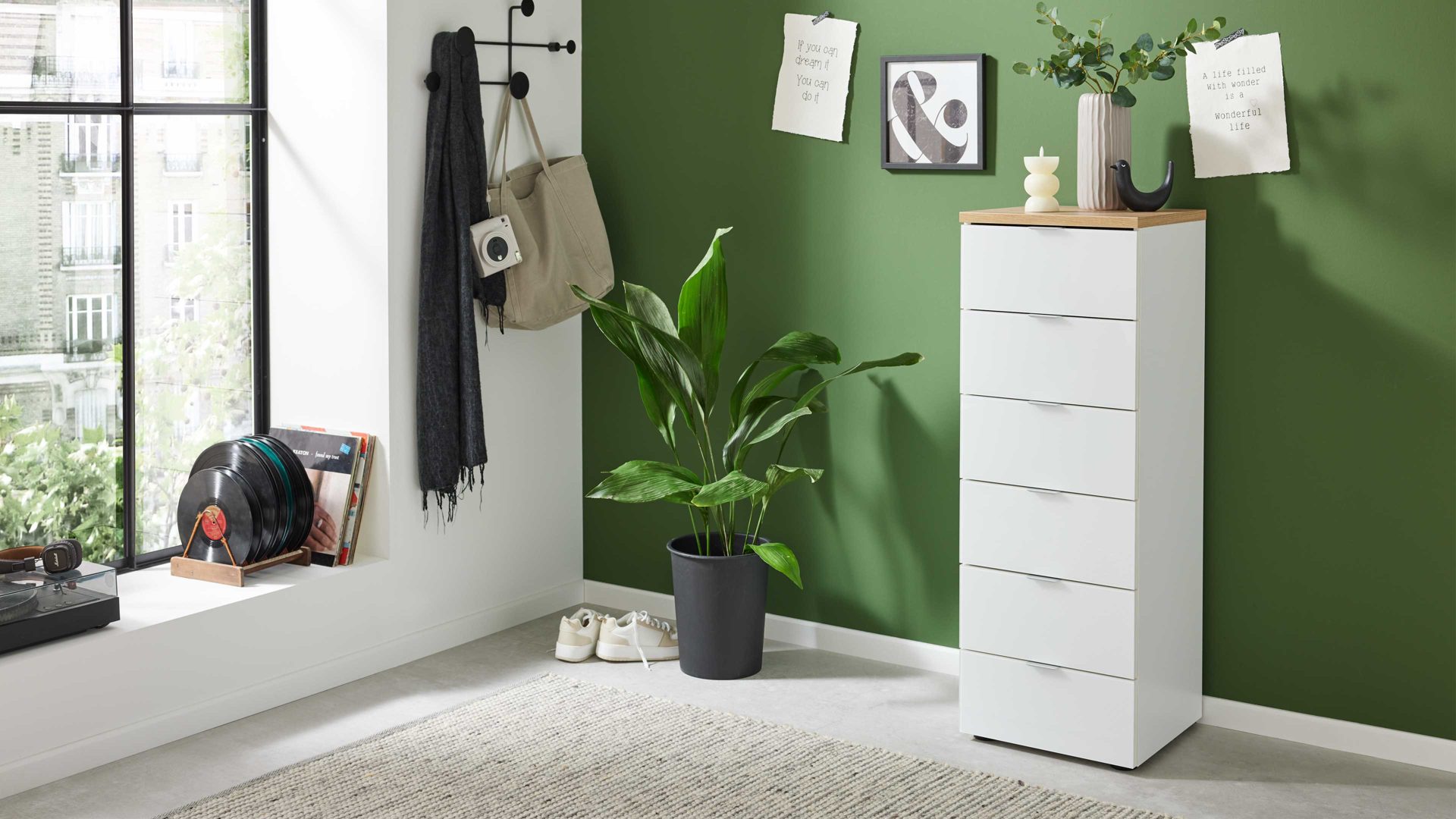 Kreideweiß & Nebraska Eiche – vier Schubladen