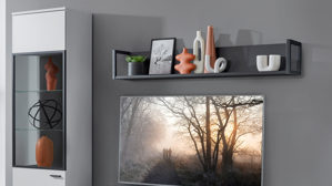 • Die Abbildung zeigt ein Wohnbeispiel, welches auch Dekoration sowie separat erhältliches Zubehör enthält. Im Lieferumfang enthalten ist ein Regal.